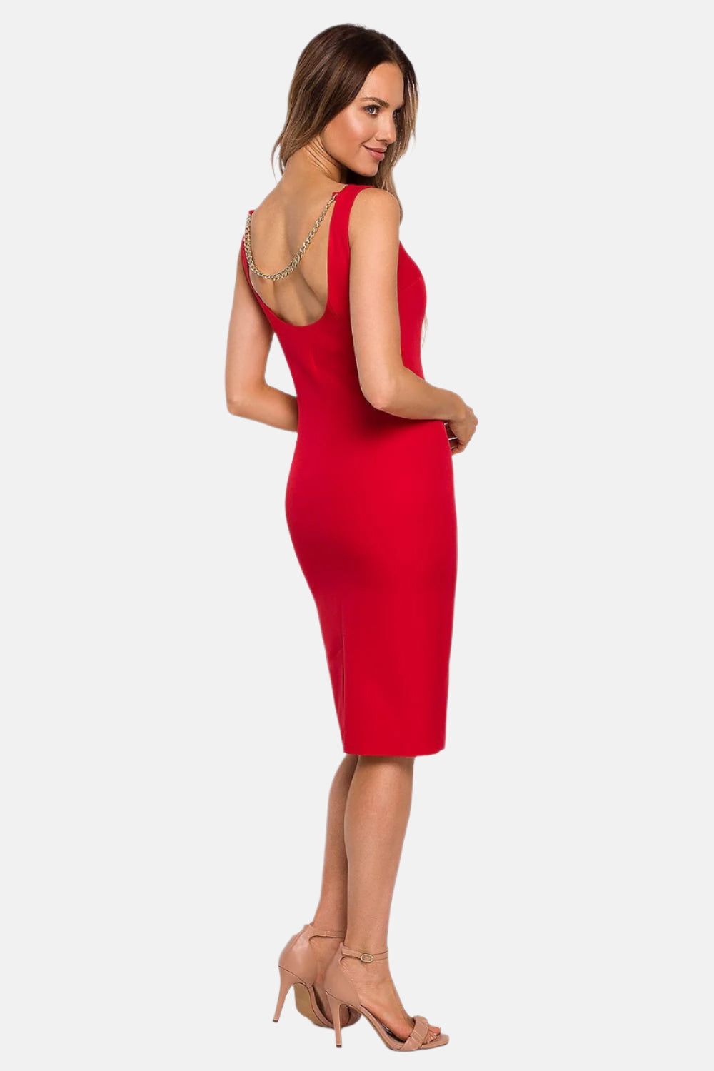 Classic with a touch of sophistication, sleeveless pencil dress, exposing shoulders and emphasizing shapes, with a deep neckline on the back decorated with a chain. Dress is fastened with a covered zipper.